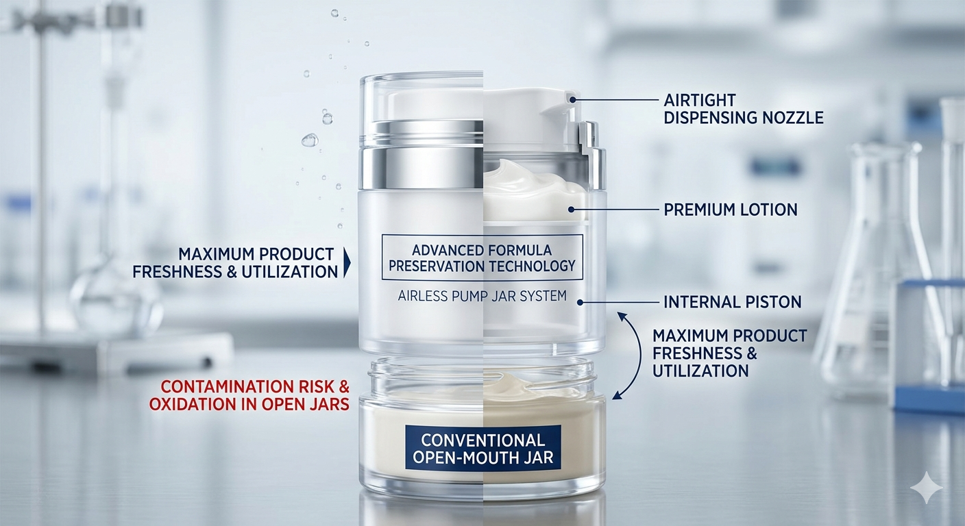 La principale raison du changement d’industrie est que pots de pompe airless prolonger considérablement la durée de conservation des produits de soin naturels et sans conservateurs en éliminant l’exposition à l’air. Alors que les consommateurs exigent une « beauté propre » avec moins de stabilisants synthétiques, les emballages doivent assumer le rôle de protection. Les bocaux traditionnels permettent à l'oxygène d'entrer à chaque fois que le couvercle est ouvert, entraînant la dégradation rapide des ingrédients actifs comme la vitamine C, le rétinol et diverses huiles botaniques.
